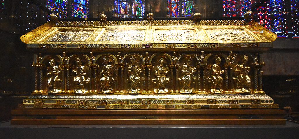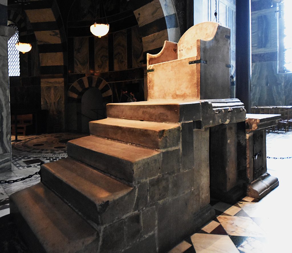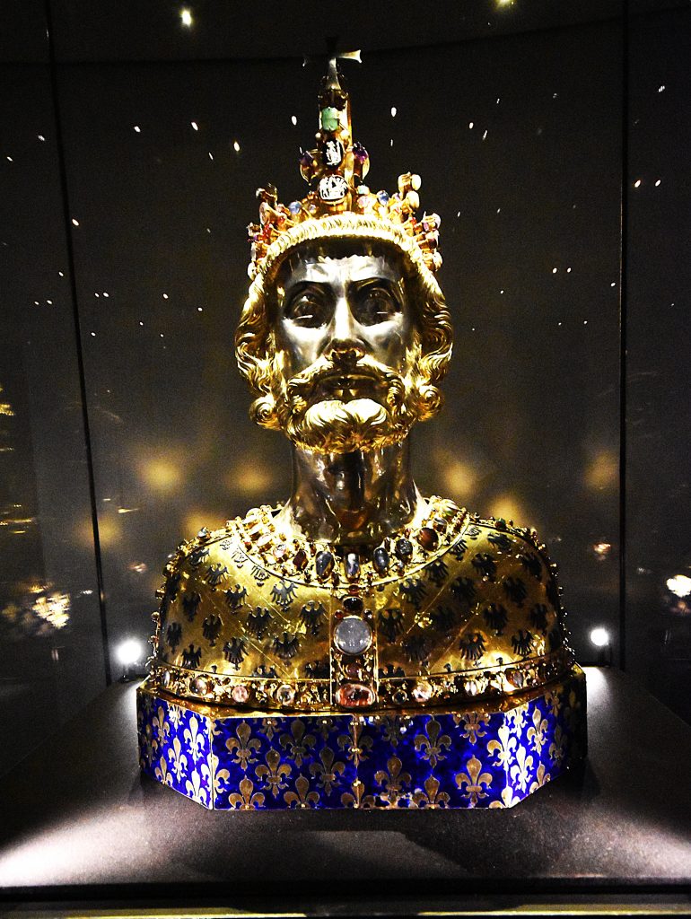 Aachen became Charlemagne’s favorite residence, partly due to the hot thermal springs on which he built his cathedral. There, the throne he had constructed for future coronations became the place where kings were crowned for the next 800 years. The throne itself may be less visually impressive than expected, but knowing how many rulers were crowned there—and its historical significance—gave me goosebumps. Charlemagne is also buried in the cathedral, in a golden shrine, see pictures below.