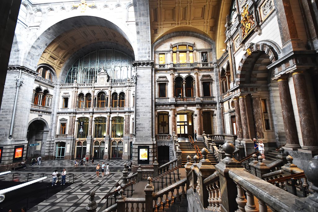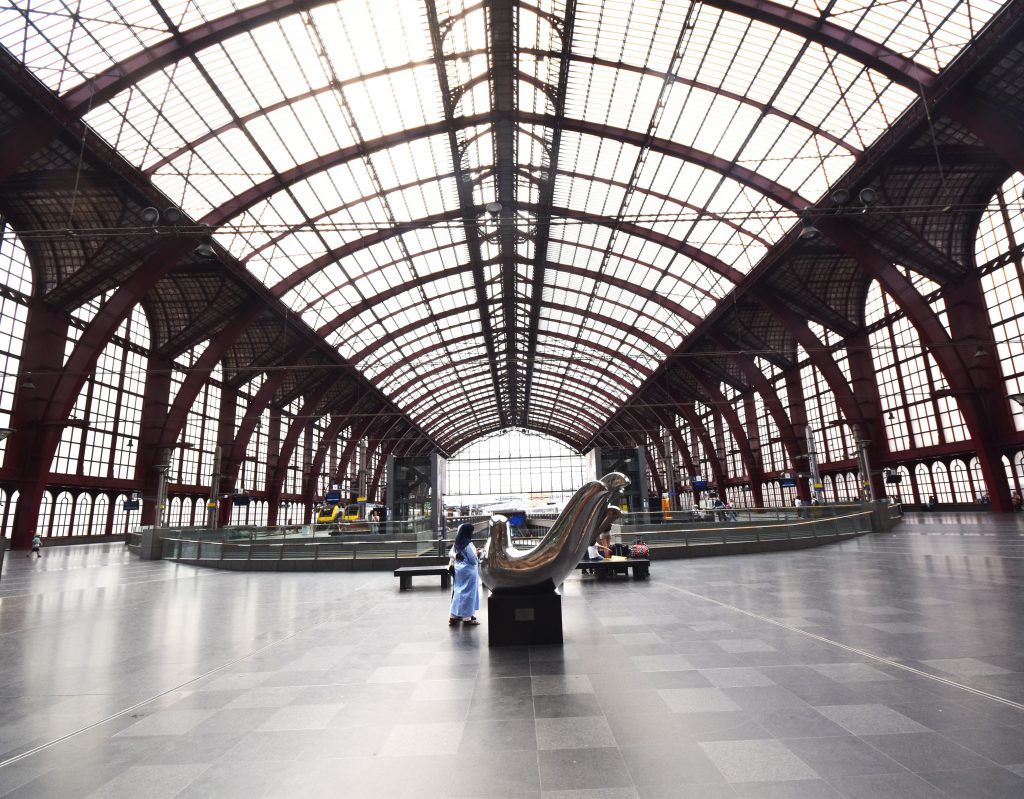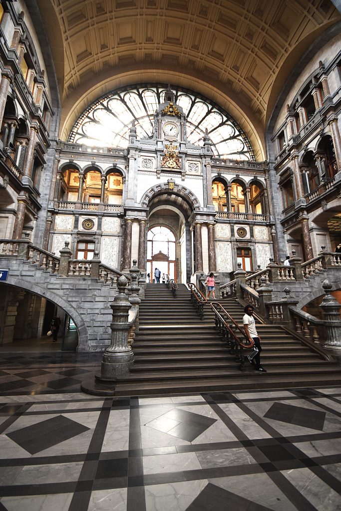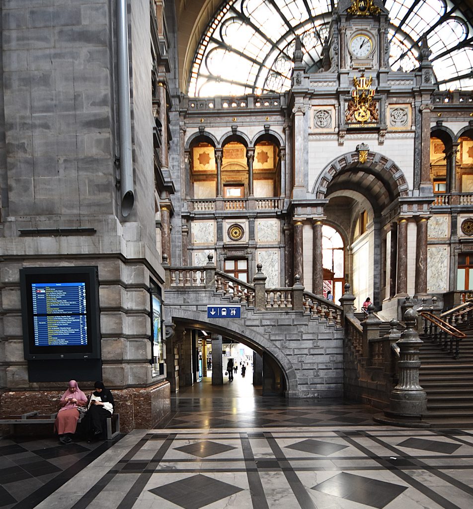 While cycling through Belgium and the Netherlands, I can’t help but admire the infrastructure here. The density of roads and bridges, industry, and bikeways (!) is amazing. Most amazing are the trains. Sooner or later, a train runs alongside the bikeway—speedy and elegant—sometimes two of them at the same time. So, obviously, there need to be stations too. The one in Antwerp, ranked No. 5 on Newsweek’s list of the “Best Stations” in the world, is an example of Belgium’s efficient infrastructure, as well as a massive statement in favor of public transportation.
