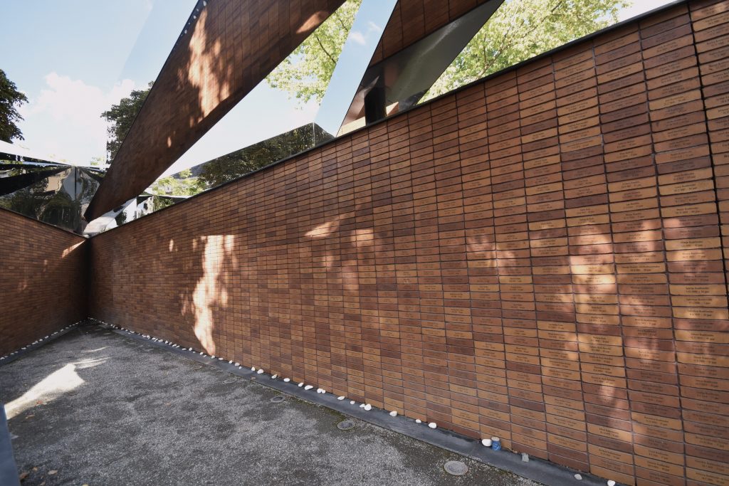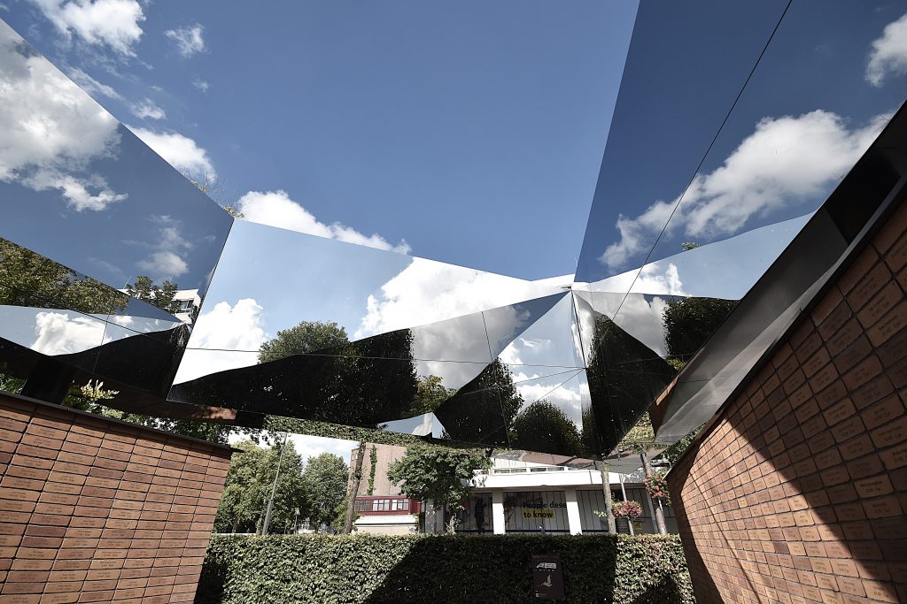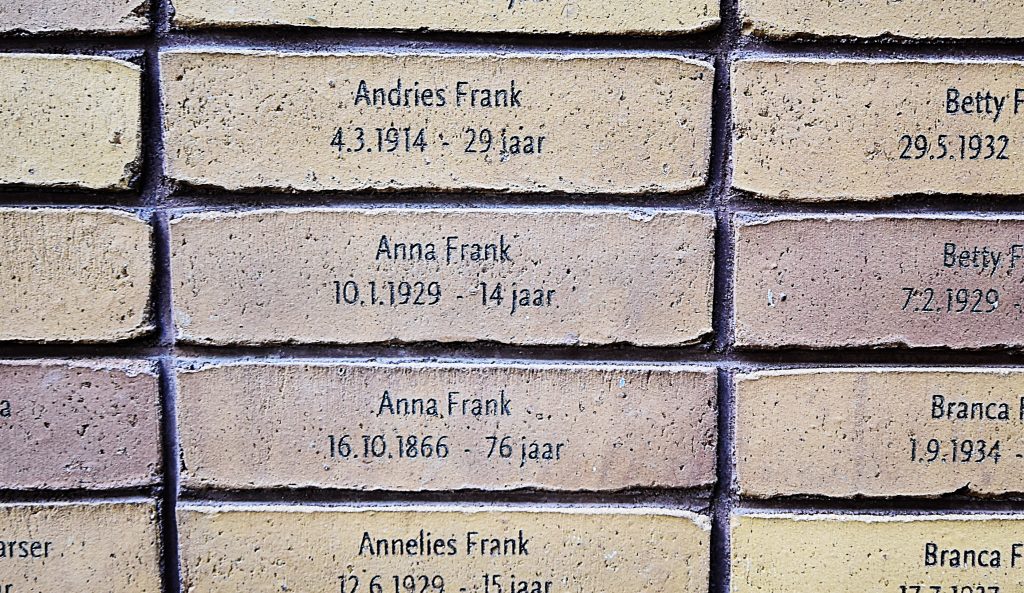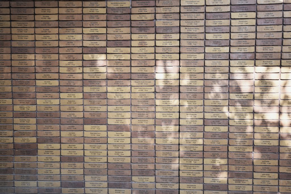 There is a memorial in the heart of Amsterdam, consisting of more than 100,000 bricks, with each brick bearing the name of a victim. Among them is the name Anna Frank—Anne Frank—as she was a resident of Amsterdam. The many bricks are topped with massive mirror constructions that visually connect the memorial to the outside world. Finally, the four bodies formed by the bricks, seen from above, represent the Hebrew word לזכר (Lezachar), which means “in memory.”