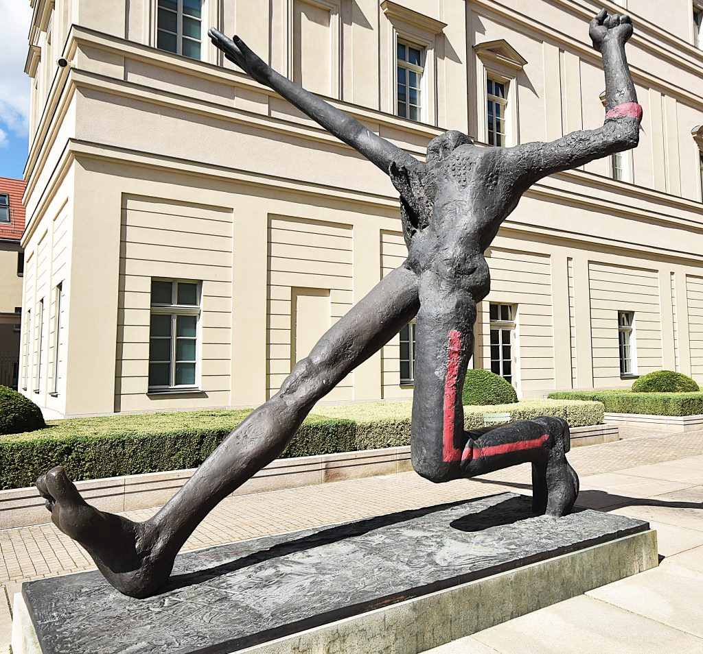 One artist who got more and more critical over time was Wolfgang Mattheuer. His most famous work stands in the yard of the Museum Barberini in Potsdam. You don’t even have to buy a ticket to see it because the yard is open to the public. The bronze sculpture, called Der Jahrhundertschritt (“Step of the Century”), is about sixteen feet tall. It shows a figure with one arm raised in a Nazi salute, while the other ends in a fist—that was the communist salute back in the 1920s. One foot is bare and stepping forward, the other wears a military boot and stays firmly on the ground. The clothes have stripes like uniforms, but there’s no head—just a skull sticking out from a blown-up chest.