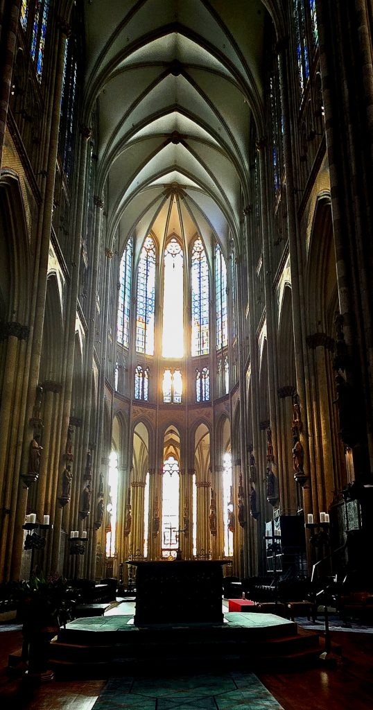 When construction resumed in 1823—by then, the church had become a symbol of national unity—it was soon decided that the Gothic style would be continued, with a slight update: it became “neo-Gothic.” That choice gave, and still gives, the Cologne Cathedral a consistent, pure Gothic appearance. Some architects even call it “the perfect cathedral.” All the angles and measurements inside the church are highly repetitive; the eye is surprised neither by anything un-Gothic, nor by any measurement not in harmony with the rest.